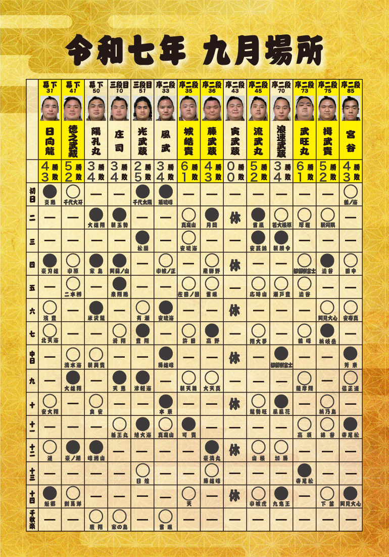 ○:勝ち/●:負け/□:不戦勝/■:不戦敗/や:休み/―:取組なし